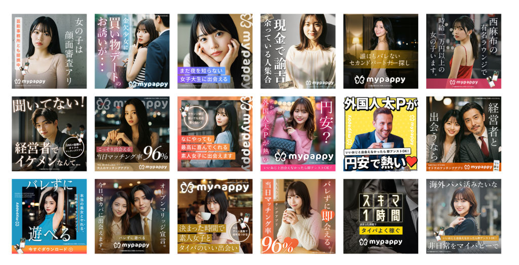 オトナ向けマッチングアプリ「mypappy」のバナー広告のデザインを担当しました。
