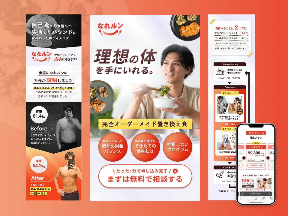 ターゲットが抱える「体型・健康への不安」→「自己管理が続かない悩み」→「仕事の集中力・成果への影響」といった課題を起点に、課題提示 → 解決策 → なれルンだからこそ実現できる理由という流れで構成することで、納得感を持ってサービスの魅力を理解できる導線を意識しています。